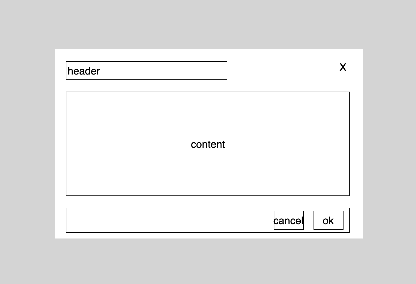 在开始组件设计之前希望大家对css3和js有一定的基础,并了解基本的react/vue语法.我们先来解构一下Modal组件, 一个Modal分为以下几个部分: