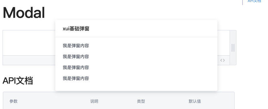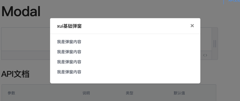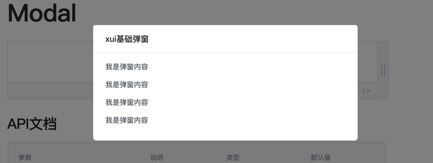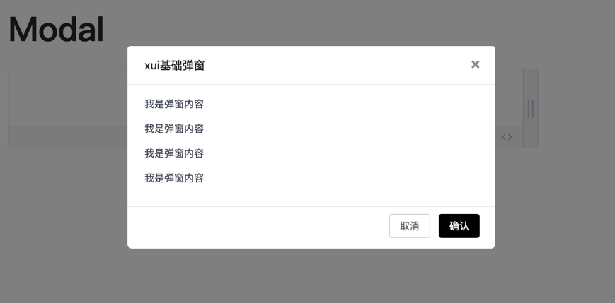 <Modal title="xui基础弹窗" centered mask={false} visible={false}>