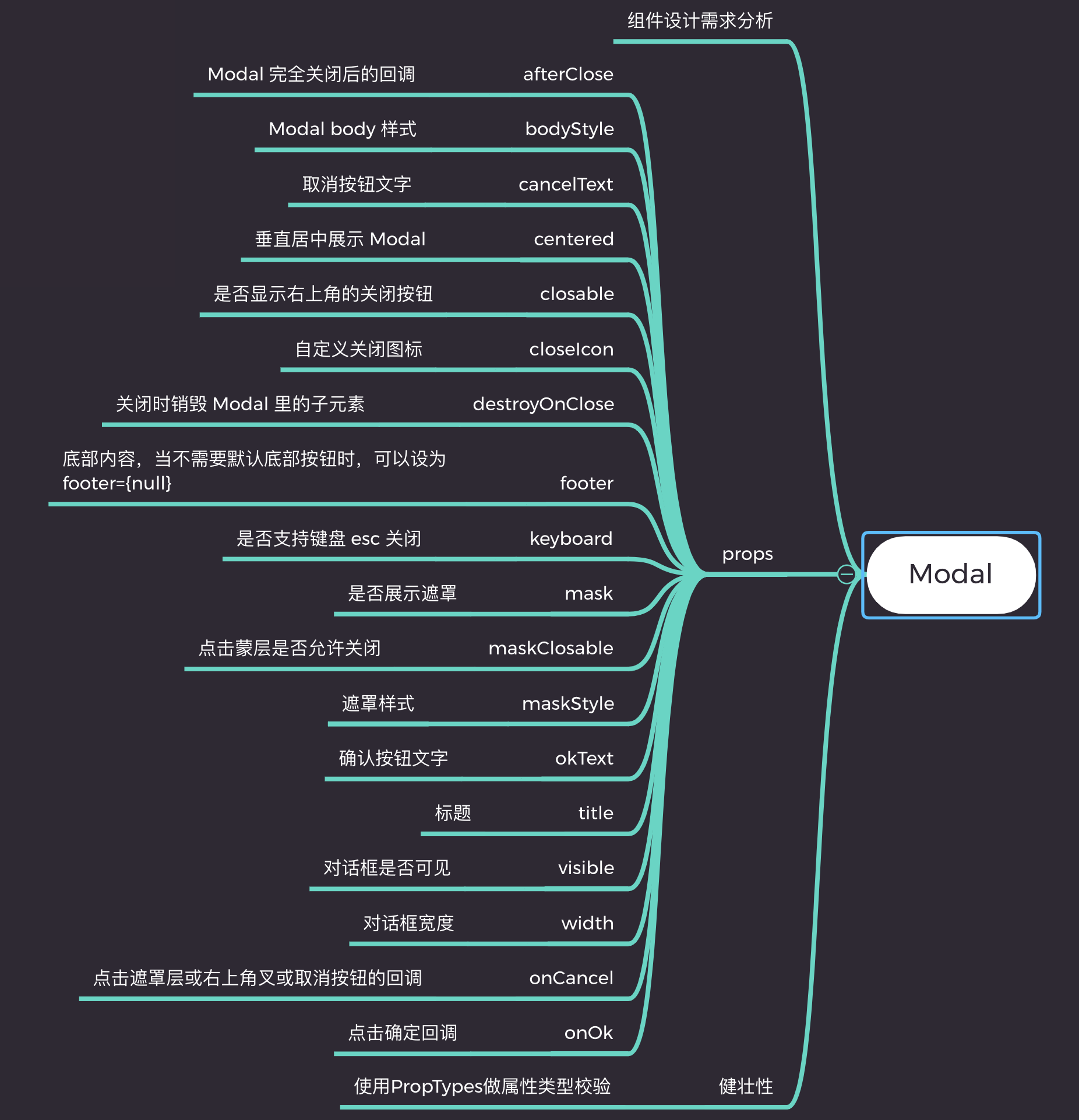 按照之前笔者总结的组件设计原则,我们第一步是要确认需求. 模态框(Modal)组件一般会有如下需求点: