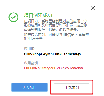创建之后,系统会弹出分配的应用ID和秘钥,应点击下载,及时保存: