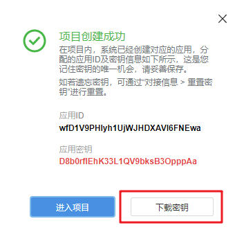 创建之后,系统会弹出分配的应用ID和秘钥,应点击下载,及时保存: