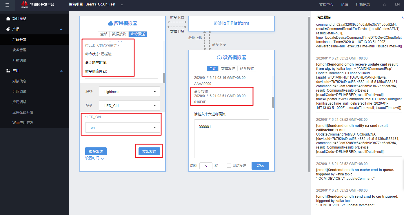 设备数据上报成功,接下来测试命令下发: