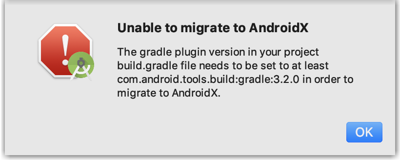 小菜通过 Android Studio 中的 Migrate to AndroidX 来配合升级(纯手动升级需要修改巨多的文件),选择本工程 -> Refactor -> Migrate to Androidx;但小菜当前 Gradle 版本是 3.0.0,此时提示 Gradle 需 >= 3.2.0,故小菜需要先升级 Gradle;