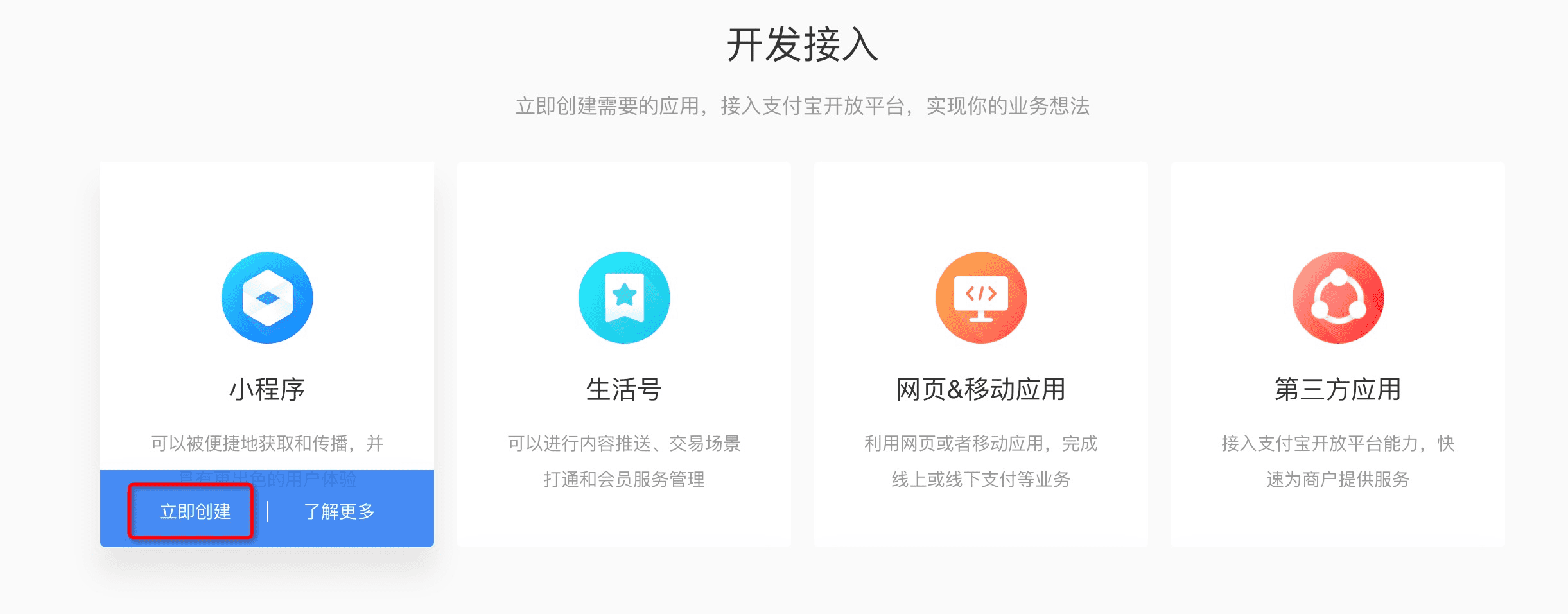 如果您尚未注册支付宝开发者账号,使用支付宝账号登录 蚂蚁金服开放平台,并完成开发者身份注册。详细信息请参见 开发者入驻说明。 - 创建支付宝小程序应用