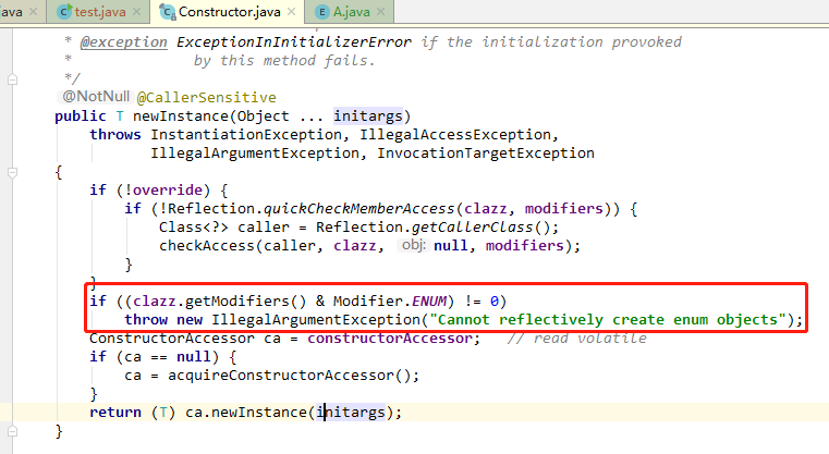 我们发现报错信息的位置已经换了,现在是已经有构造方法,而是在newInstance方法的时候报错了,我们跟下源码发现,人家已经明确写明了如果是枚举类型,直接抛出异常,代码如下,所以是无法使用反射来操作枚举类型的数据的。