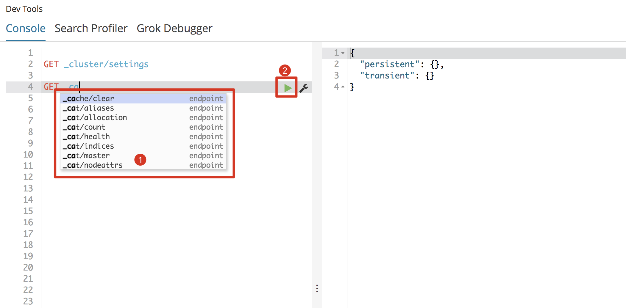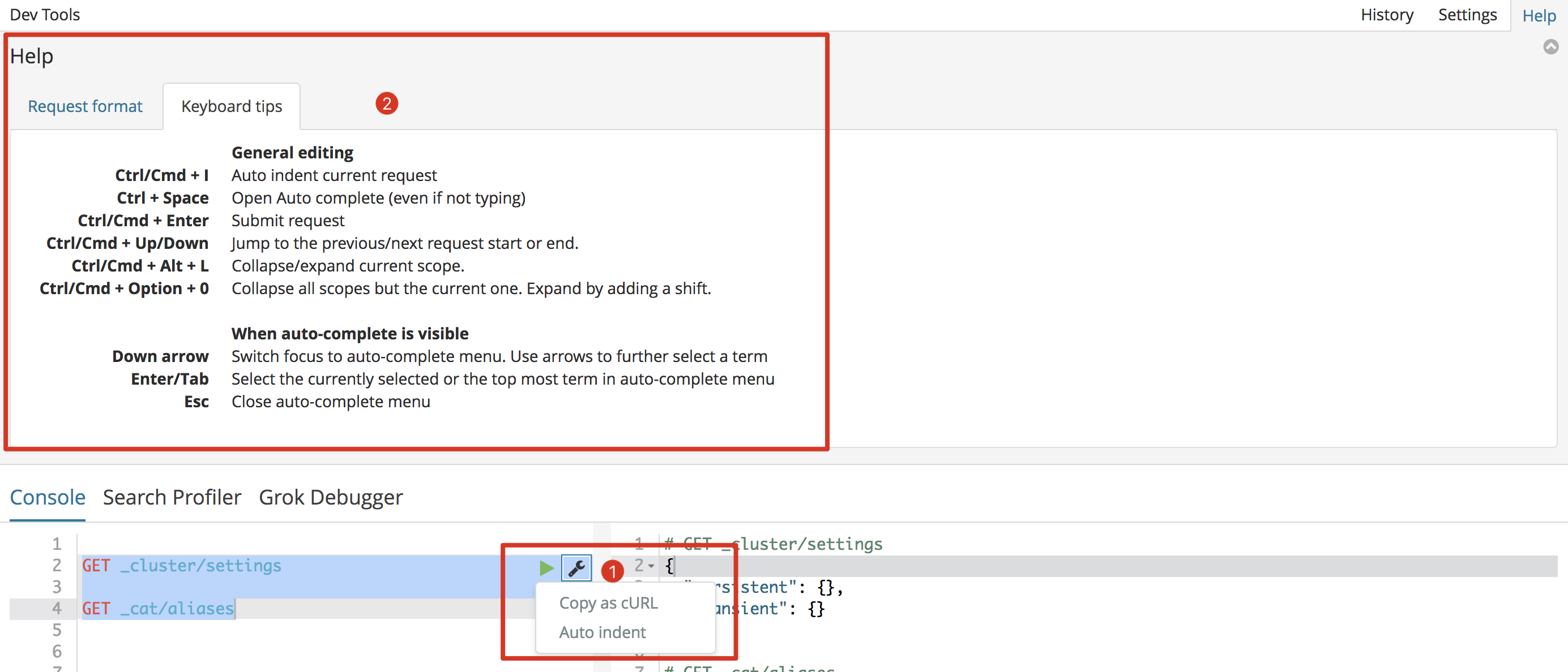 上图即为 Dev Tools Console 插件的界面,左边栏为请求输入框,右边栏为返回结果。左边栏可以包含多条请求命令,当你输入命令时,会有自动提示,该功能非常强大(如1所示),当你面对 elasticsearch 繁多的 api 时,很难记住所有的名字,有了自动提示和补全,可以有效提高你拼写 api 的效率。当你写好命令后,点击2的按钮就可以执行该请求。输入框中可以有多条命令,好处一是可以一次执行多条命令,只要选中要执行的命令,然后点击2按钮就可以了;好处二是可以回顾或执行历史命令,方便做对照。