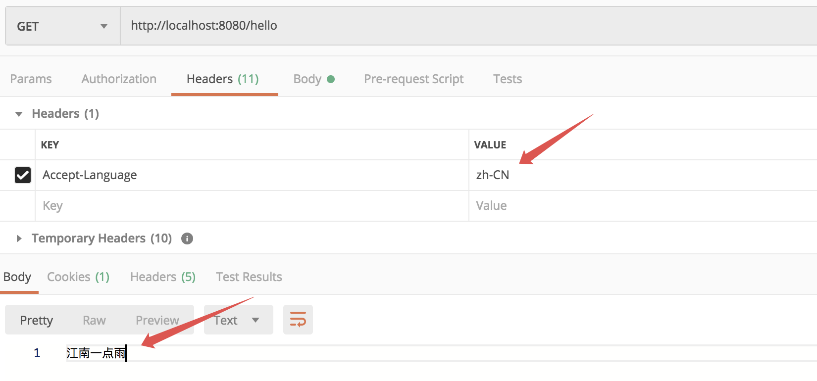 默认情况下,在接口调用时,通过请求头的 Accept-Language 来配置当前的环境,我这里通过 POSTMAN 来进行测试,结果如下: