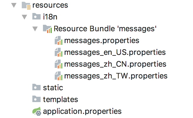 - messages.properties 这个是默认的配置,其他的则是不同语言环境下的配置,en_US 是英语(美国),zh_CN 是中文简体,zh_TW 是中文繁体(文末附录里边有一个完整的语言简称表格)。