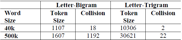 以 50 万个单词的词库为例,2 个字母的切分粒度的单词冲突为 1192(冲突的定义:至少有两个单词的 letter-bigram 向量完全相同),而 3 个字母的单词冲突降为 22 效果很好,且转化后的向量空间 3 万维不是很大,综合考虑选择 3 个字母的切分粒度。