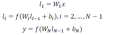 用 Wi 表示第 i 层的权值矩阵,bi 表示第 i 层的 bias 项。则第一隐层向量 l1(300 维),第 i 个隐层向量 li(300 维),输出向量 y(128 维)可以分别表示为:
