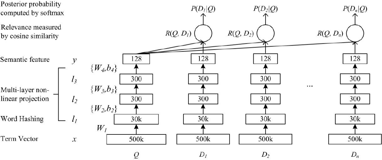Query 和 Doc 的语义相似性可以用这两个语义向量(128 维) 的 cosine 距离来表示: