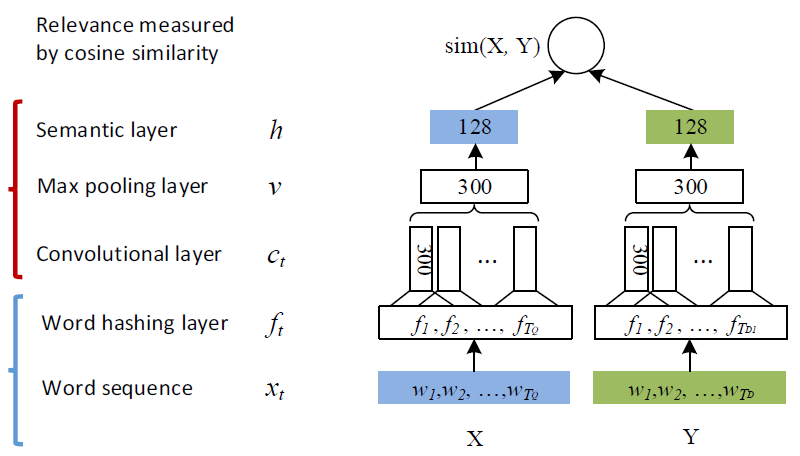 针对 DSSM 词袋模型丢失上下文信息的缺点,CLSM[2](convolutional latent semantic model)应运而生,又叫 CNN-DSSM。CNN-DSSM 与 DSSM 的区别主要在于输入层和表示层。