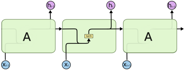 假设输入 xi 为一个 query 中几个连续的词,hi 为输出。那么上一个神经元的输出 h(t-1) 与当前细胞的输入 Xt 拼接后经过 tanh 函数会输出 ht,同时把 ht 传递给下一个细胞。