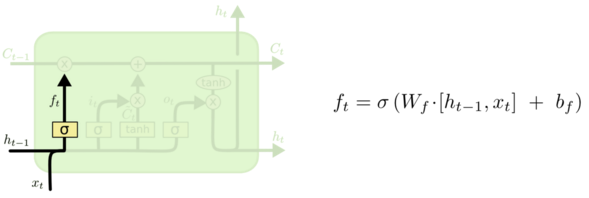 遗忘门 [5]由 Gers 提出,它用来控制细胞状态 cell 有哪些信息可以通过,继续往下传递。如下图所示,上一层的输出 h(t-1) concat 上本层的输入 xt,经过一个 sigmoid 网络(遗忘门)产生一个从 0 到 1 的数值 ft,然后与细胞状态 C(t-1) 相乘,最终决定有多少细胞状态可以继续往后传递。