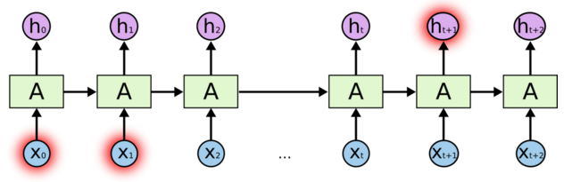 不幸的是,在这个间隔不断增大时,RNN 会逐渐丧失学习到远距离信息的能力。因为 RNN 随着距离的加长,会导致梯度消失。简单来说,由于求导的链式法则,直接导致梯度被表示为连乘的形式,以至梯度消失(几个小于 1 的数相乘会逐渐趋向于 0)。