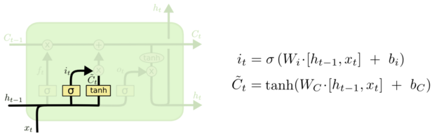 输入门决定要新增什么信息到细胞状态,这里包含两部分:一个 sigmoid 输入门和一个 tanh 函数。sigmoid 决定输入的信号控制,tanh 决定输入什么内容。如下图所示,上一层的输出 h(t-1) concat 上本层的输入 xt,经过一个 sigmoid 网络(输入门)产生一个从 0 到 1 的数值 it,同样的信息经过 tanh 网络做非线性变换得到结果 Ct,sigmoid 的结果和 tanh 的结果相乘,最终决定有哪些信息可以输入到细胞状态里。