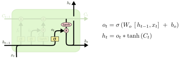 输出门决定从细胞状态要输出什么信息,这里也包含两部分:一个 sigmoid 输出门和一个 tanh 函数。sigmoid 决定输出的信号控制,tanh 决定输出什么内容。如下图所示,上一层的输出 h(t-1) concat 上本层的输入 xt,经过一个 sigmoid 网络(输出门)产生一个从 0 到 1 的数值 Ot,细胞状态 Ct 经过 tanh 网络做非线性变换,得到结果再与 sigmoid 的结果 Ot 相乘,最终决定有哪些信息可以输出,输出的结果 ht 会作为这个细胞的输出,也会作为传递个下一个细胞。