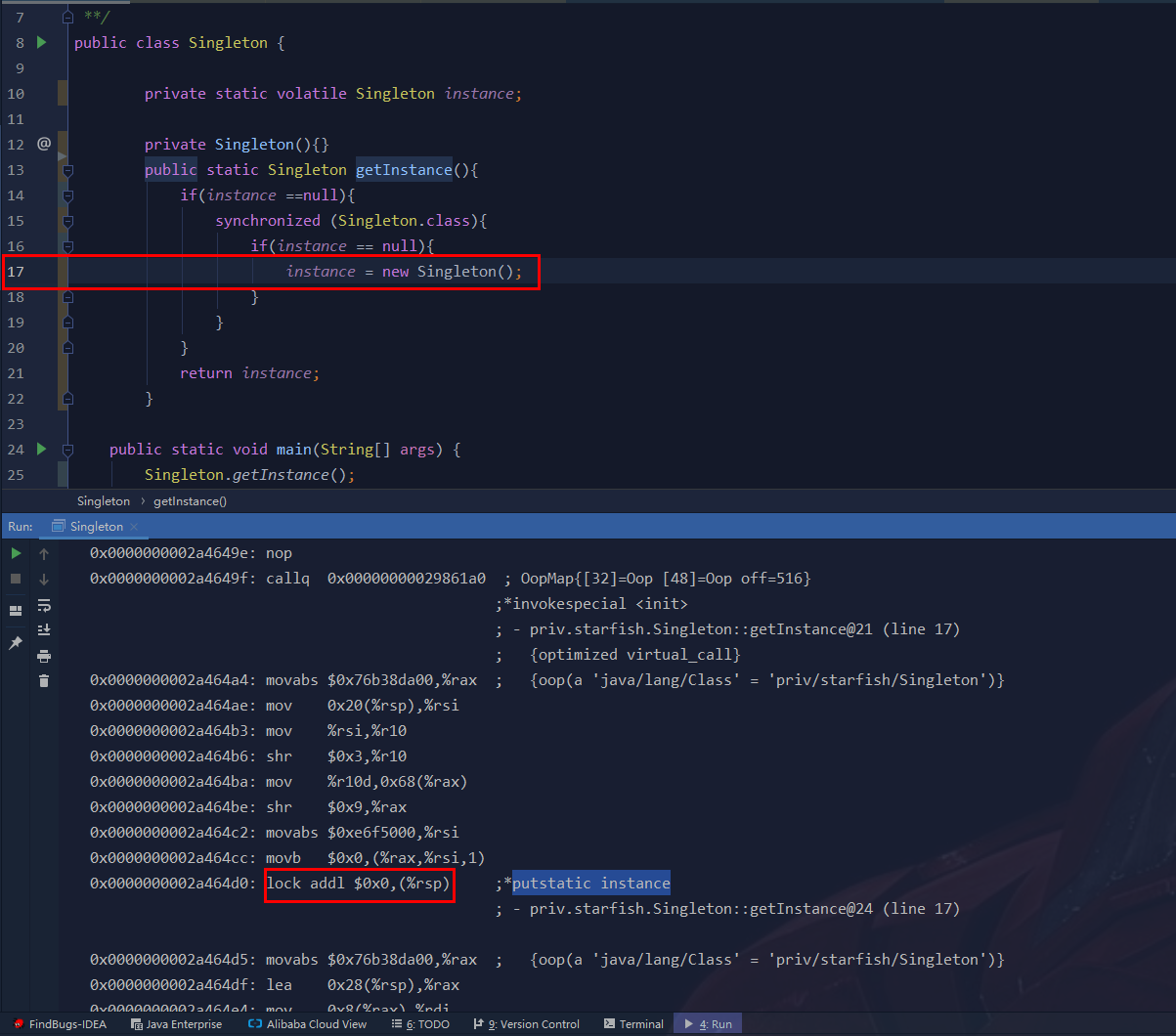 (PS:具体的汇编指令对我这个 Javaer 太南了,但是 JVM 字节码我们可以认识,putstatic 的含义是给一个静态变量设置值,那这里的 putstatic instance ,而且是第 17 行代码,更加确定是给 instance 赋值了。果然像各种资料里说的,找到了 lock add1 据说还得翻阅。这里可以看下这两篇 https://www.jianshu.com/p/6ab7c3db13c3 、 https://www.cnblogs.com/xrq730/p/7048693.html )