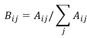 那么,在此处,我们现在已知节点间相似度矩阵A,如果定义两个节点间相似度越大,其发生相互跳转的概率越大,这样我们便可以得到转移概率矩阵B,其中