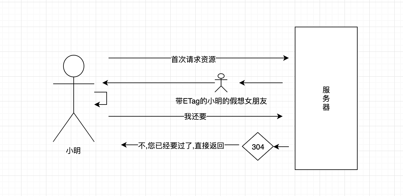 由服务端根据资源内容生成一段 hash 字符串,标识资源的状态,用户第一次请求时服务器会将ETag随着资源一起返回给浏览器, 再次请求时浏览器会将这串字符串传回服务器,验证资源是否已经修改,如果没有修改直接使用缓存.具体流程可以是如下情景: