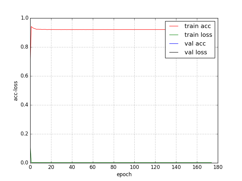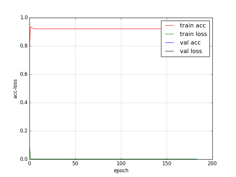 实验结果: dataFormat为2的情况: Using TensorFlow backend. load data begin... load data..., no random! load done Data.shape= (11000, 2, 429) label.shape= (11000, 5) dataFormat = 2, need to reshape to 1 reshape data shape= (11000, 858) reshape label shape= (11000, 5) data_train.shape= (8000, 858) data_test.shape= (3000, 858) label_train.shape= (8000, 5) label_test.shape= (3000, 5) construct net begin... Training... Epoch 1/200 200/8000 [..............................] - ETA: 3:41 - loss: 0.2301 - acc: 0.1100 1400/8000 [====>.........................] - ETA: 27s - loss: 0.5132 - acc: 0.6029 2800/8000 [=========>....................] - ETA: 10s - loss: 0.2827 - acc: 0.6343 4200/8000 [==============>...............] - ETA: 5s - loss: 0.1952 - acc: 0.6555 5600/8000 [====================>.........] - ETA: 2s - loss: 0.1478 - acc: 0.7166 7000/8000 [=========================>....] - ETA: 0s - loss: 0.1191 - acc: 0.7551 8000/8000 [==============================] - 6s 749us/step - loss: 0.1048 - acc: 0.7755 Epoch 2/200 200/8000 [..............................] - ETA: 0s - loss: 0.0039 - acc: 0.9100 1600/8000 [=====>........................] - ETA: 0s - loss: 0.0040 - acc: 0.9262 3000/8000 [==========>...................] - ETA: 0s - loss: 0.0039 - acc: 0.9330 4400/8000 [===============>..............] - ETA: 0s - loss: 0.0037 - acc: 0.9327 5800/8000 [====================>.........] - ETA: 0s - loss: 0.0036 - acc: 0.9348 7200/8000 [==========================>...] - ETA: 0s - loss: 0.0036 - acc: 0.9342 8000/8000 [==============================] - 0s 40us/step - loss: 0.0035 - acc: 0.9326 Epoch 3/200 200/8000 [..............................] - ETA: 0s - loss: 0.0021 - acc: 0.9450 1600/8000 [=====>........................] - ETA: 0s - loss: 0.0020 - acc: 0.9181 3000/8000 [==========>...................] - ETA: 0s - loss: 0.0020 - acc: 0.9227 4400/8000 [===============>..............] - ETA: 0s - loss: 0.0020 - acc: 0.9225 5800/8000 [====================>.........] - ETA: 0s - loss: 0.0020 - acc: 0.9205 7200/8000 [==========================>...] - ETA: 0s - loss: 0.0020 - acc: 0.9224 8000/8000 [==============================] - 0s 39us/step - loss: 0.0020 - acc: 0.9215 Epoch 182/200 200/8000 [..............................] - ETA: 0s - loss: 0.0024 - acc: 0.9250 1600/8000 [=====>........................] - ETA: 0s - loss: 0.0021 - acc: 0.9231 3000/8000 [==========>...................] - ETA: 0s - loss: 0.0020 - acc: 0.9203 4400/8000 [===============>..............] - ETA: 0s - loss: 0.0020 - acc: 0.9180 5800/8000 [====================>.........] - ETA: 0s - loss: 0.0020 - acc: 0.9179 7200/8000 [==========================>...] - ETA: 0s - loss: 0.0020 - acc: 0.9206 8000/8000 [==============================] - 0s 39us/step - loss: 0.0020 - acc: 0.9215 Epoch 183/200 200/8000 [..............................] - ETA: 0s - loss: 0.0020 - acc: 0.9100 1600/8000 [=====>........................] - ETA: 0s - loss: 0.0019 - acc: 0.9150 3000/8000 [==========>...................] - ETA: 0s - loss: 0.0019 - acc: 0.9160 4400/8000 [===============>..............] - ETA: 0s - loss: 0.0020 - acc: 0.9186 5800/8000 [====================>.........] - ETA: 0s - loss: 0.0020 - acc: 0.9184 7200/8000 [==========================>...] - ETA: 0s - loss: 0.0020 - acc: 0.9218 8000/8000 [==============================] - 0s 40us/step - loss: 0.0020 - acc: 0.9215 Epoch 184/200 200/8000 [..............................] - ETA: 0s - loss: 0.0019 - acc: 0.9200 1600/8000 [=====>........................] - ETA: 0s - loss: 0.0020 - acc: 0.9194 3000/8000 [==========>...................] - ETA: 0s - loss: 0.0020 - acc: 0.9143 4400/8000 [===============>..............] - ETA: 0s - loss: 0.0020 - acc: 0.9195 5800/8000 [====================>.........] - ETA: 0s - loss: 0.0020 - acc: 0.9207 7200/8000 [==========================>...] - ETA: 0s - loss: 0.0020 - acc: 0.9219 8000/8000 [==============================] - 0s 40us/step - loss: 0.0020 - acc: 0.9215 Epoch 00184: early stopping Testing ------------ 200/3000 [=>............................] - ETA: 0s 2600/3000 [=========================>....] - ETA: 0s 3000/3000 [==============================] - 0s 26us/step test cost: [0.001527793175773695, 0.89100000063578289] ./saveProcessResult/processb_200FIL_858FO_572SO_572EO_5_0521-11_00dataFormat2.png