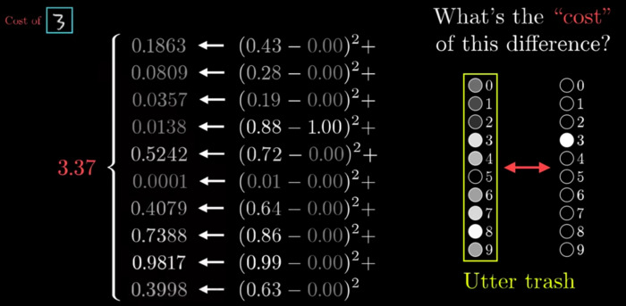 以及每次尝试为神经网络设置13002个权重激活值之后,表示我们的这些待定值离成功还有多远的代价值cost的算法,神经网络的代价值是输出结果减去期望结果,然后平方求和: