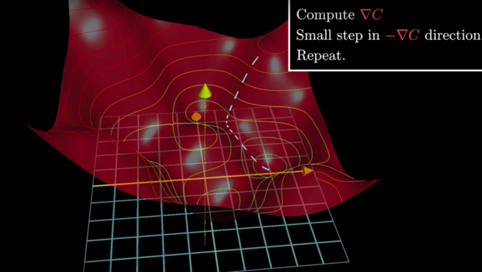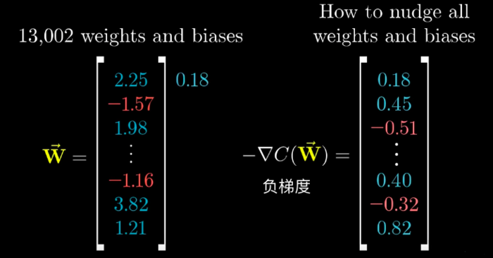 经过这样的算法,多维曲面的梯度的每个维度(对应13002个权重和偏置),然后把这个梯度叠加到原来的13002个权重和偏置上去,重新计算,就会产生新的Cost,然后再反向计算回去,调整新的权重和偏置,以此往复,直到最后13002个权重和偏置产生的运算结果最接近我们的期望结果。