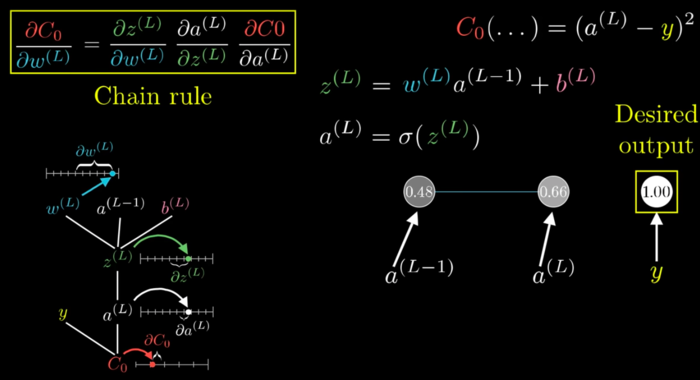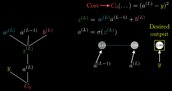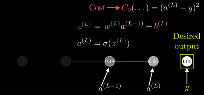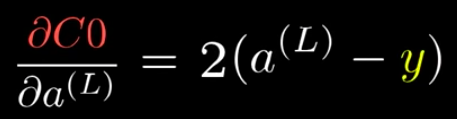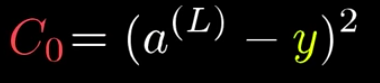 那么C0就等于最后一层每个神经元和目标层对应神经元相减的平方,在这里只有一个神经元,就是(a(L)-y)2
