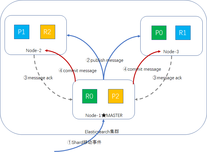 - 如果在指定时间内,指定数量的node都返回了ack消息,那么cluster state就会被commit,然后master node把 commit message发送给所有的node。所有的node接收到那个commit message之后,接着才会将之前接收到的集群状态应用到自己本地的状态副本中去。