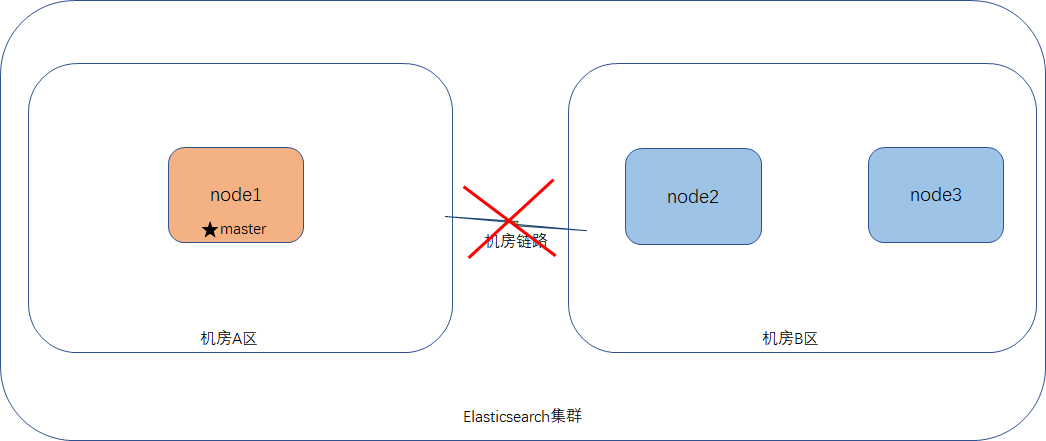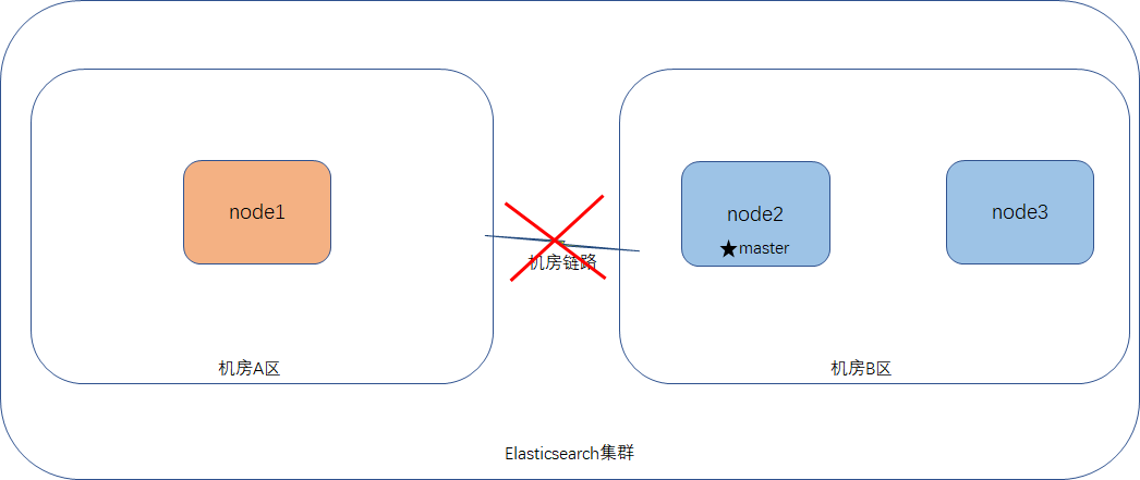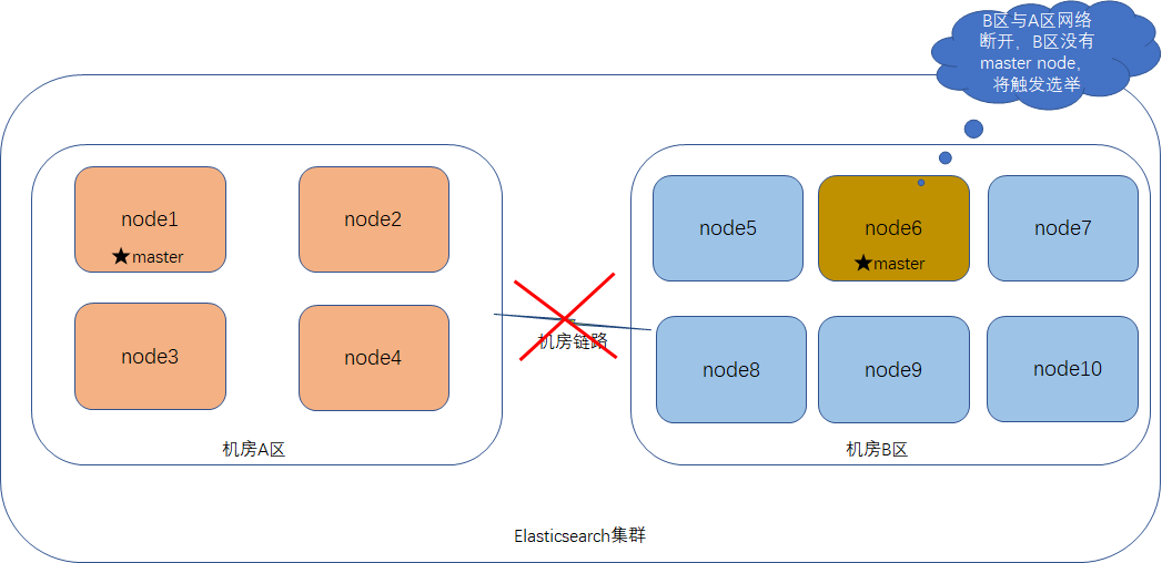 在Elasticsearch集群中,master node非常重要,并且只有一个,相当于整个集群的大脑,控制将整个集群状态的更新,如果Elasticsearch集群节点之间出现区域性的网络中断,比如10个节点的Elasticsearch集群,4台node部署在机房A区,6台node部署在机房B区,如果A区与B区的交换机故障,导致两个区隔离开来了,那么没有master node的那个区,会触发master选举,如果选举了新的master,那么整个集群就会出现两个master node,这种现象叫做脑分裂。