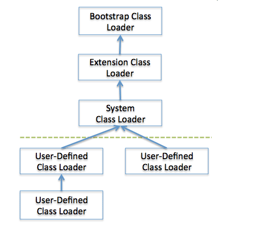 该模型要求除了顶层的 Bootstrap class loader 启动类加载器外,其余的类加载器都应当有自己的父类加载器。子类加载器和父类加载器不是以继承(Inheritance)的关系来实现,而是通过组合(Composition)关系来复用父加载器的代码。每个类加载器都有自己的命名空间(由该加载器及所有父类加载器所加载的类组成,在同一个命名空间中,不会出现类的完整名字(包括类的包名)相同的两个类;在不同的命名空间中,有可能会出现类的完整名字(包括类的包名)相同的两个类)
