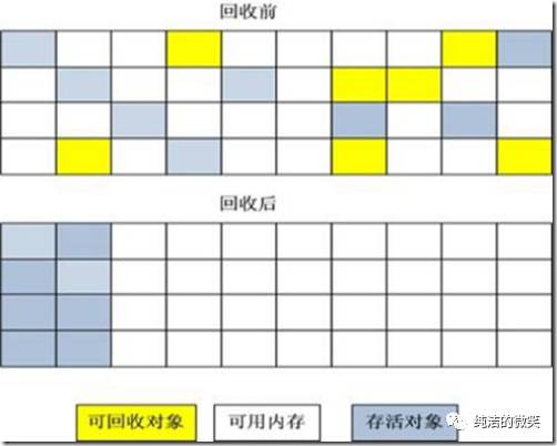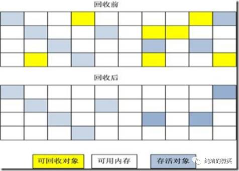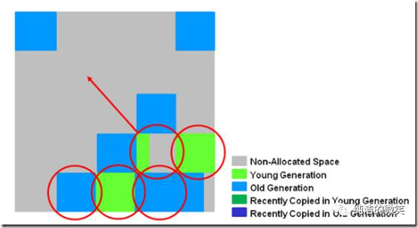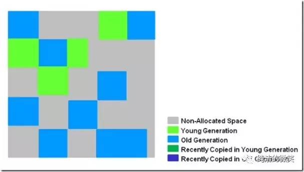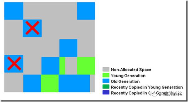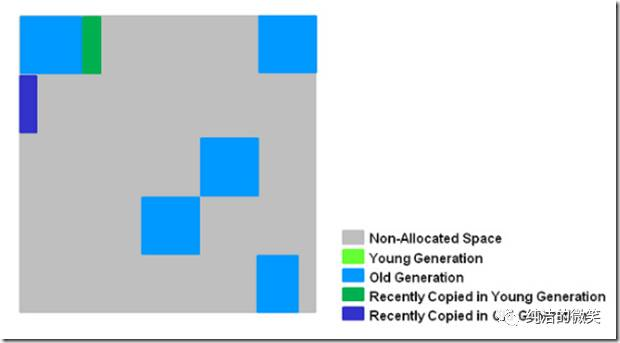 6、复制/清除过程后。回收区域的活性对象已经被集中回收到深蓝色和深绿色区域。