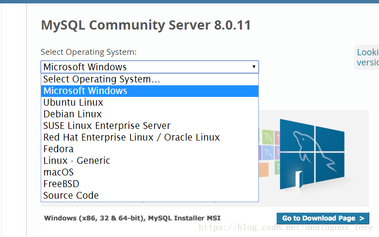 我们下载mysql community版本(免费的),下载地址:https://dev.mysql.com/downloads/mysql/,类型我们选Microsoft: