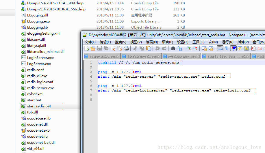 mysql没问题了,接下来我们要启动一下redis,通过第二篇文章我们知道redis需要启动两次,也就是一共两个redis进程,我们游戏服务中分别称为redis-server和redis-login-server(它们的配置文件信息不一样),我们可以在Server\Bin\x64\Release目录下手动cmd命令行执行下列语句: