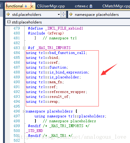 }注意一点哈,不知道大家有没有发现,我们代码中大量使用C++11中的std::bind()这样函数,注意由于我们使用的Visual Studio版本是2010,2010这个版本是不支持C++11的,所以这里的std::bind不是C++11的,而是C++11发布之前的草案tr1中的,所以全部的命名空间应该是tr1::std::bind,其他的类似C++11的功能也是一样,所以你在代码中可以看到这样引入命名空间的语句: