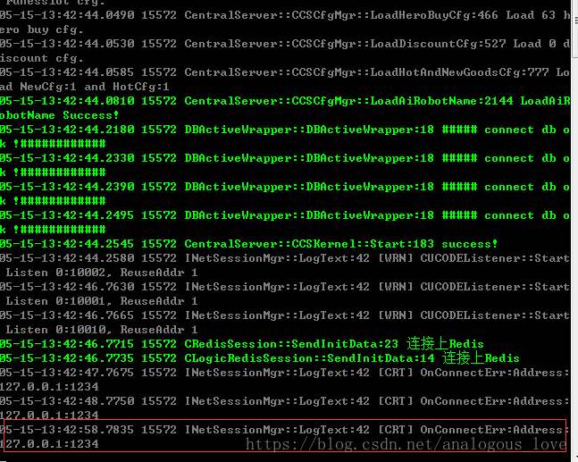 上图中我们看到Mysql和redis服务均已连上,但是程序会一直提示连接127.0.0.1:1234端口连不上。由此我们断定,这个使用1234端口的服务没有启动。这不是我们介绍的重点,重点是说明这个服务会定时自动重连这个1234端口,自动重连机制是我们做服务器开发必须熟练开发的一个功能。所以我建议大家好好看一看这一块的代码。我们这里带着大家简单梳理一遍吧。