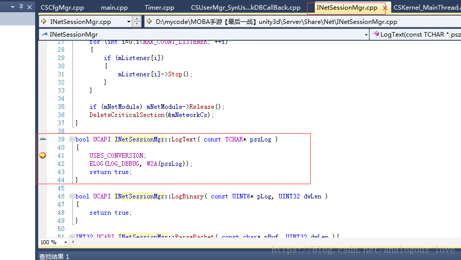 首先,我们根据提示找到INetSessionMgr::LogText的42行,并在那里加一个断点: