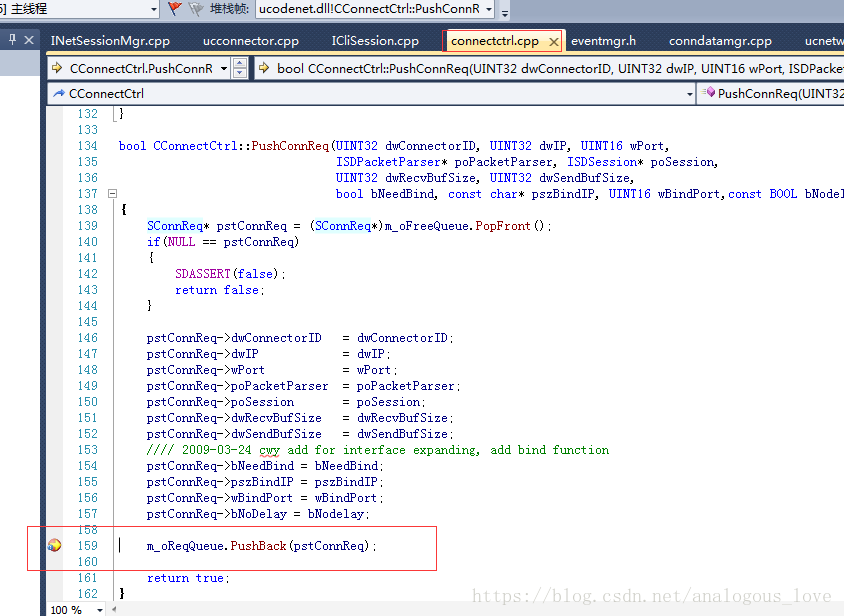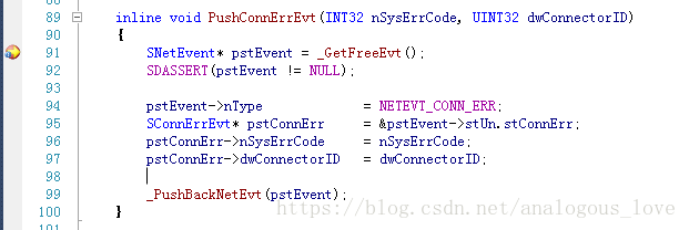 }通过这段代码我们发现队列的名字叫m_oEvtQueue,我们通过搜索这个队列的名字找到生产者,然后在生产者往队列中加入数据那里加上一个断点: