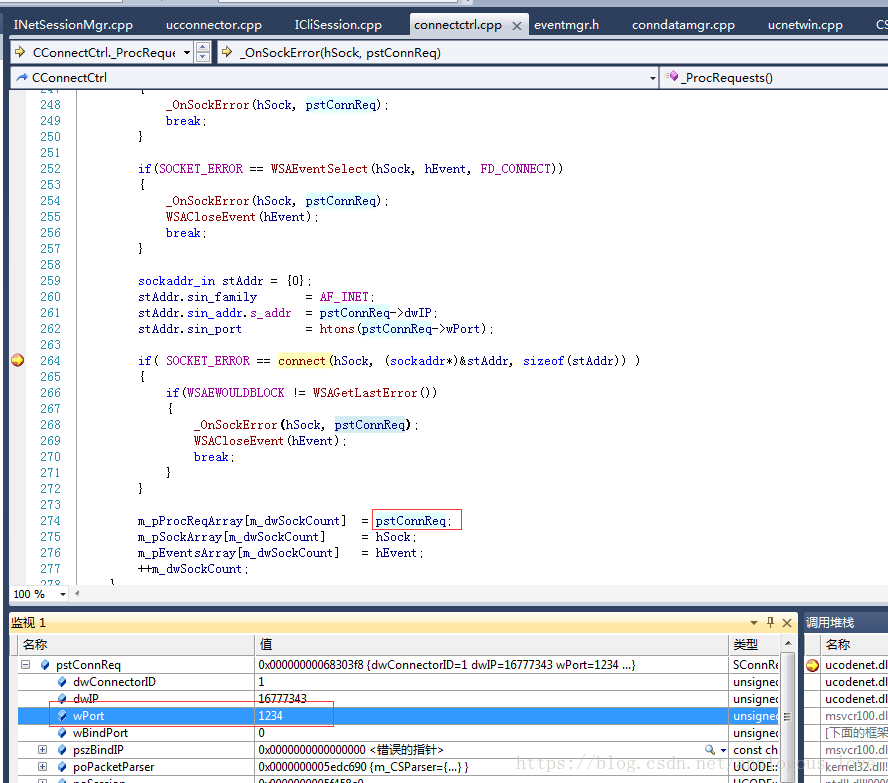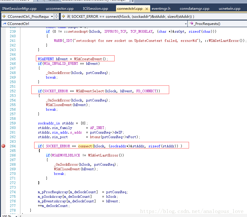 到这里我们基本上认识了,这里连接使用的异步connect(),即在线程A中将连接socket,然后使用WSAEventSelect绑定该socket并设置该socket为非阻塞模式,等连接有结果了(成功或失败)使用Windows API WSAEnumNetworkEvents去检测这个socket的连接事件(FD_CONNECT),然后将判断结果加入队列m_oEvtQueue中,另外一个线程B从队列中取出判断结果打印出日志。如果您不清楚这个流程,请学习一下异步connect的使用方法和WSAEventSelect、WSAEnumNetworkEvents的用法。那么这个异步connect在哪里呢?我们搜索一下socket API connect函数(其实我可以一开始就搜索connect函数的,但是我之所以不这么做是想让您了解一下我研究一个不熟悉的项目代码的思路),得到如下图: