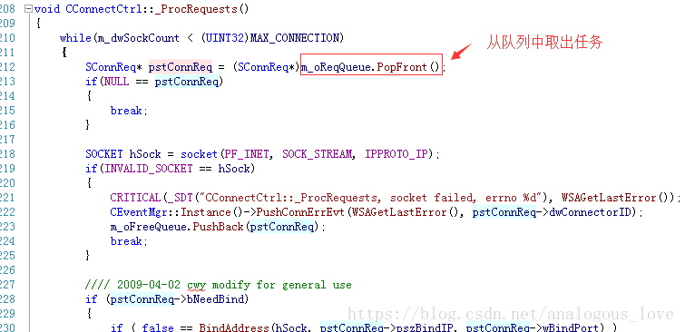 即连接失败。那么在哪里连接的呢?我们只需要看看这个队列的生产者在哪里就能找到了,因为连接不成功,往队列中放入一条连接出错的数据,我们看一下CEventMgr::Instance()->PopFrontNetEvt()的实现,找到具体的队列名称: