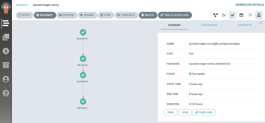 和大多数的工程师一样,我们第一个想法是自己开发,造轮子,让 TiPocket 具备调度的功能和管理的功能,但是考虑到我们目前的人力和时间,并且我们知道目前已经有很多开源的工具可以提供类似的功能,所以最后我们选择让 TiPocket 更加纯粹,将调度和管理交给更加合适的工具去负责。在考虑到我们 All-in-K8s 的特性,Argo 就成为我们不二的选择。