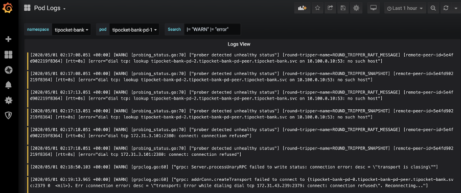 Loki 采用了跟 Prometheus 一样的 label 系统,我们可以很轻松的将 Prometheus 的监控指标与对应 pod 的日志结合起来,并且使用类似的查询语言去查询。另外 Grafana 目前也已经支持了 Loki dashboard,所以只需要使用 Grafana 就同时展示监控指标和日志了,非常方便。另一方面,TiDB 自带的监控系统中也含有 Grafana 组件,这样我就可以直接复用此 Grafana。