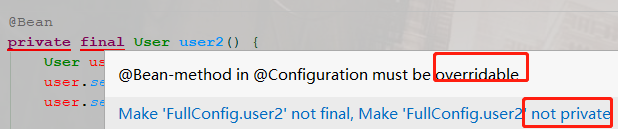 Exception in thread "main" org.springframework.beans.factory.parsing.BeanDefinitionParsingException: Configuration problem: @Bean method 'user2' must not be private or final; change the method's modifiers to continue