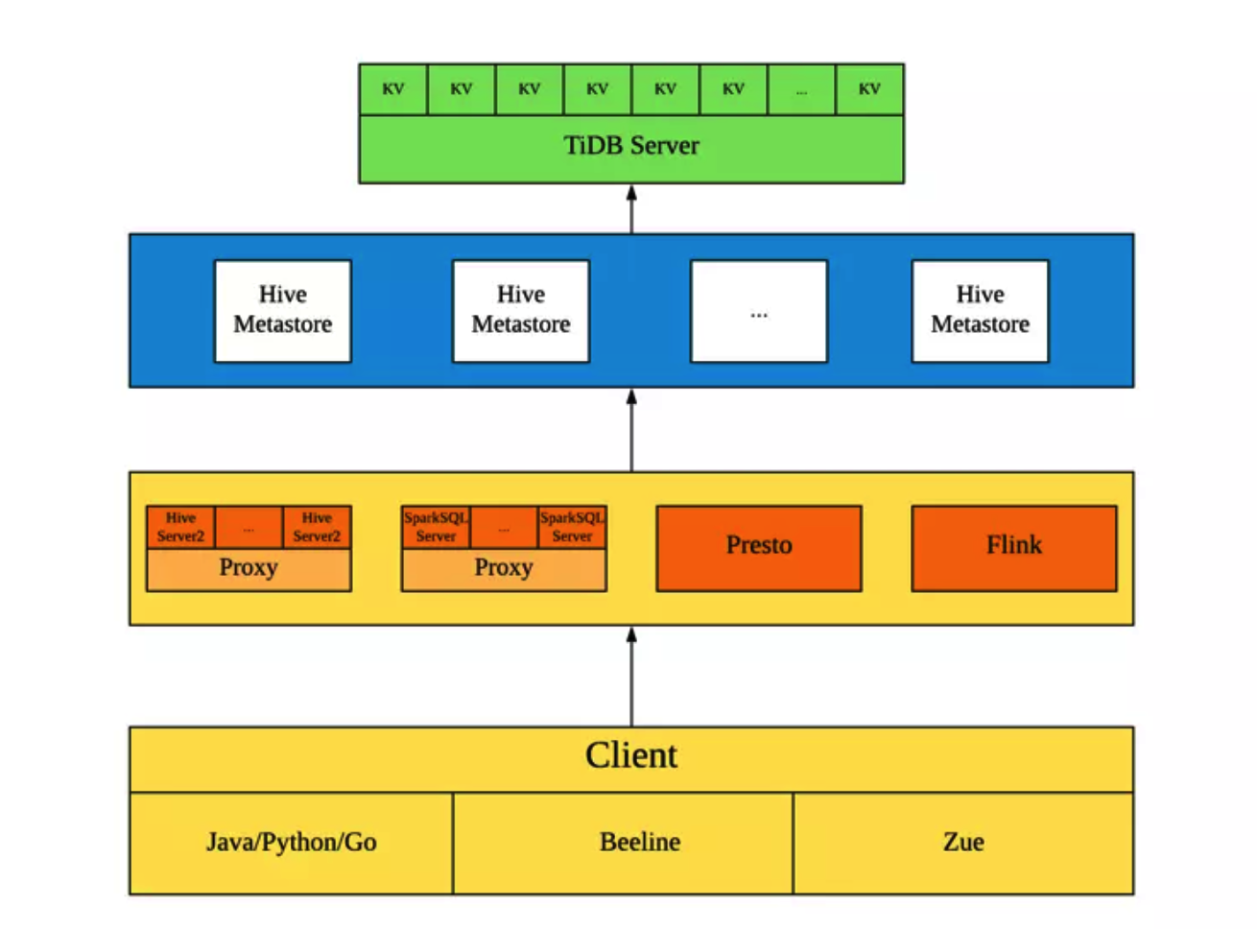 在 Hive 的元数据库迁移到 TiDB 了以后,架构几乎没有任何变化,只不过查询的压力由单台 MySQL 节点分摊到了整个 TiDB 集群,集群越大,查询效率越高,性能提升越明显。