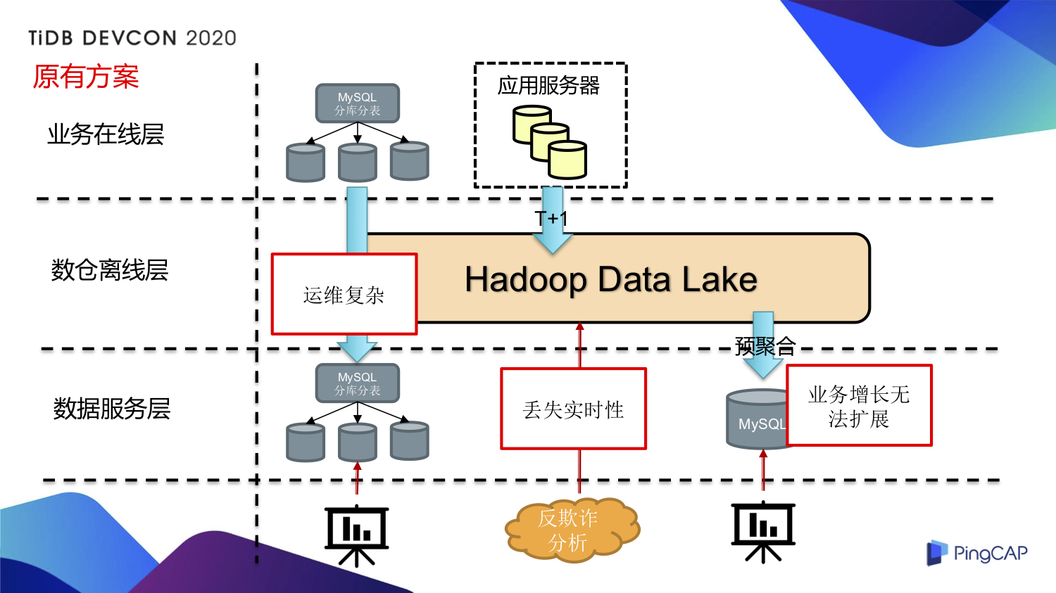 在没有 TiDB 的时候,我们怎么做?如上图所示,从业务逻辑上来划分,从上到下是业务在线层、数仓离线层和数据服务层。