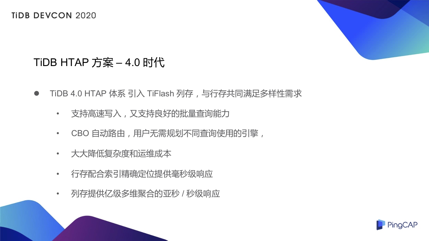 通过引入 TiDB,我们在以上三个典型业务场景上解决了遇到的各种问题。这个方案有没有不足?其实也是有的,如果 3.0 没有不足的话,可能就不会诞生今天的 4.0 。我们使用下来的感受主要是 TiDB 3.0 在 OLAP 分析这一块能力稍有些不足,TiKV 是一个基于行存的数据库,去跟一些专门做分析的列存引擎去比较,其实是没有可比性的。TiDB 如何解决这个问题?是不是 TiDB 引入一个列存引擎就可以?到了 4.0 的时候,TiDB 带着 TiFlash 这么一个列存引擎来到了我们面前。