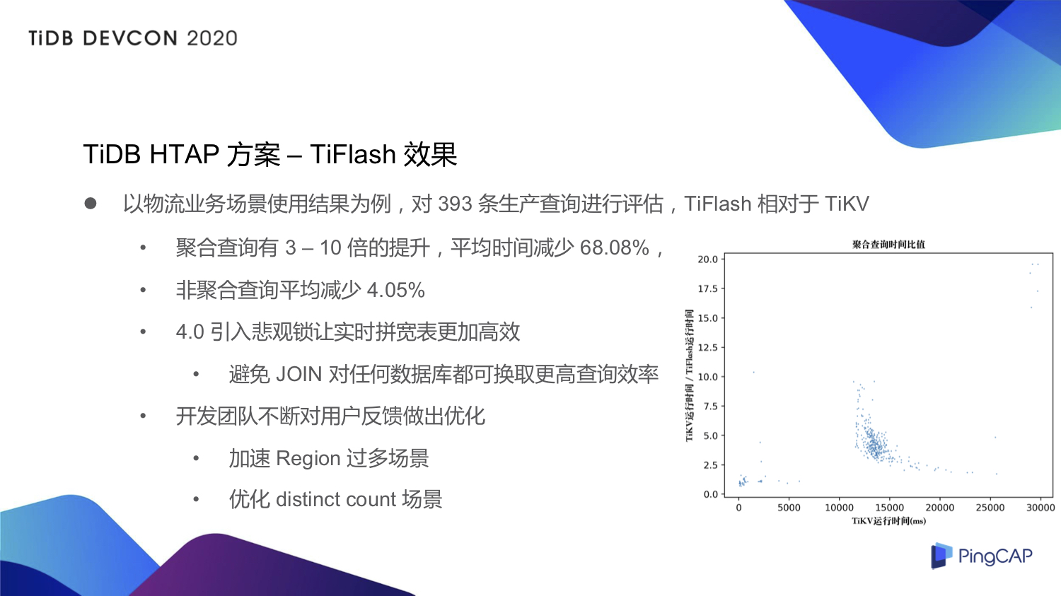 我们也对 TiFlash 做了测试,拿物流场景作为例子,我们对其中的 393 条生产查询进行评估,上图的纵轴是 TiFlash 的性能提升,从聚合查询来看,类似于 Group by、SUM 这些聚合查询,大概有三到十倍的性能提升,平均时间减少 68% 左右。如果是非聚合查询,平均时间减少 4% 左右,非聚合查询基本上都命中了 TiKV 的索引,没有走 TiFlash 的列存。