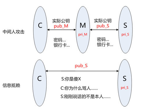 如果不验证公钥的可靠性,至少会存在如下的两个问题:中间人攻击和信息抵赖。