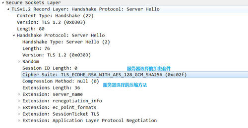 ServerHello消息将服务器选择的连接参数传送回客户端。这个消息的结构与ClientHello类似,只是每个字段只包含一个选项。服务器的加密组件内容以及压缩方法等都是从接收到的客户端加密组件内筛选出来的。