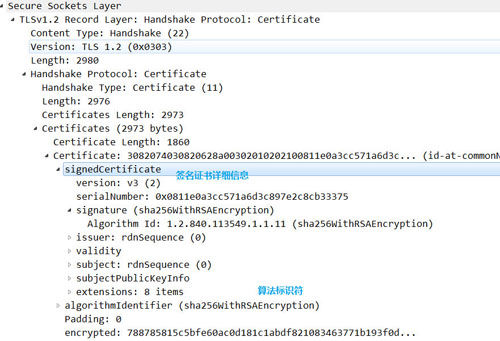 之后服务器发送Certificate报文,报文中包含公开密钥证书,服务器必须保证它发送的证书与选择的算法套件一致。不过Certificate消息是可选的,因为并非所有套件都使用身份验证,也并非所有身份验证方法都需要证书。